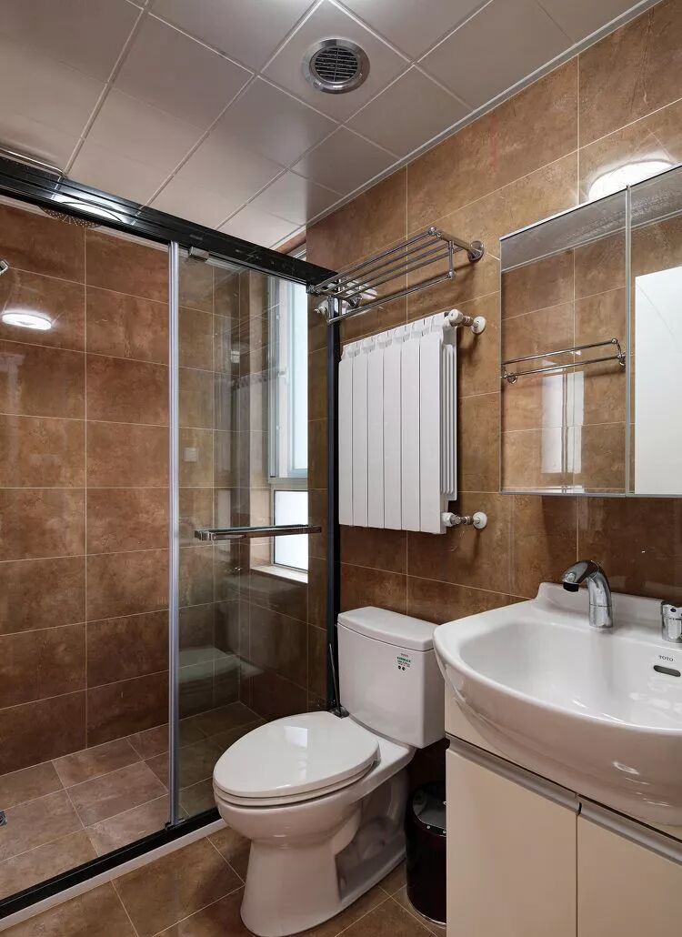 卫生间的墙地面都铺上了棕色系的仿古砖,更加的耐脏和有历史感,搭配现代感十足的淋浴房、洗手台等设计,把中式和现代完美结合起来。
