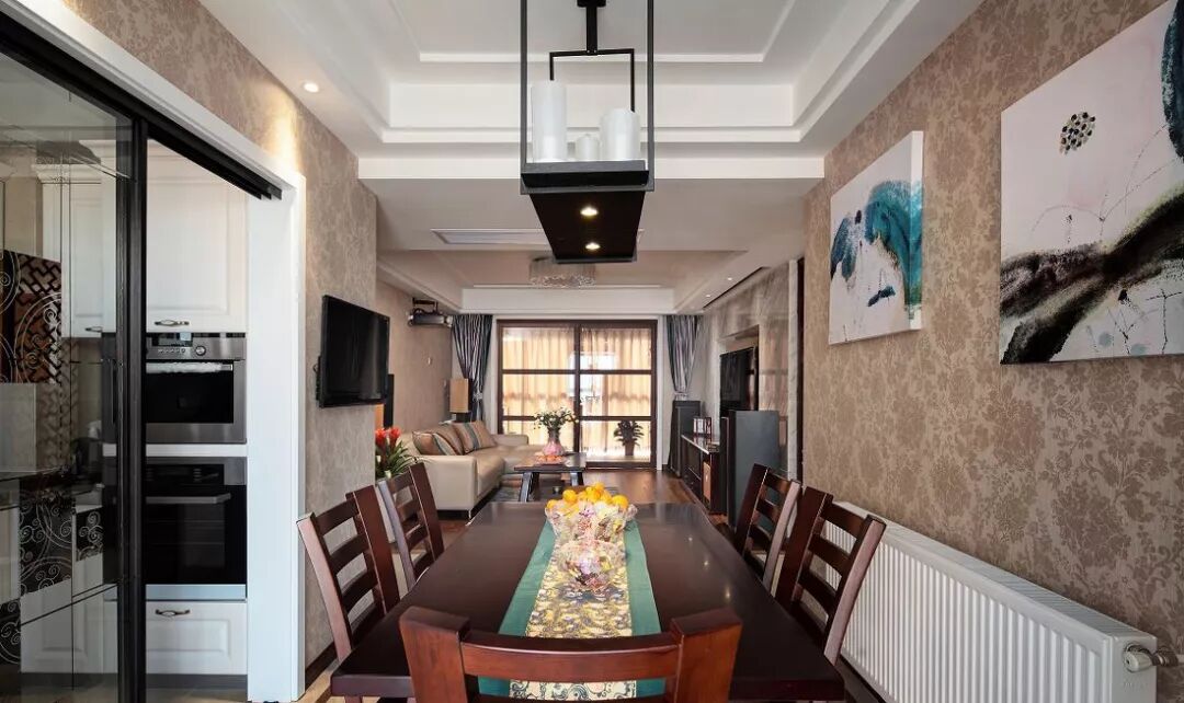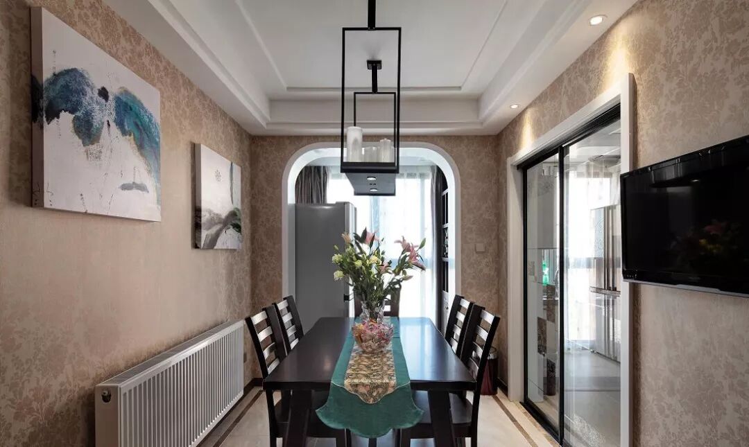 餐厅外有一个独立的阳台储物间,摆放了冰箱和储物柜,拱形门的设计更有特色,顶部的跌级吊顶也让餐厅空间更有层次感。