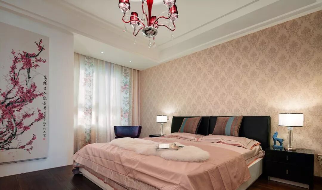 主卧室床头背景墙铺满了花式壁纸,搭配黛粉色的床品和床尾的中式风挂画、顶部的创意吊灯,都让卧室变得更为浪漫。
