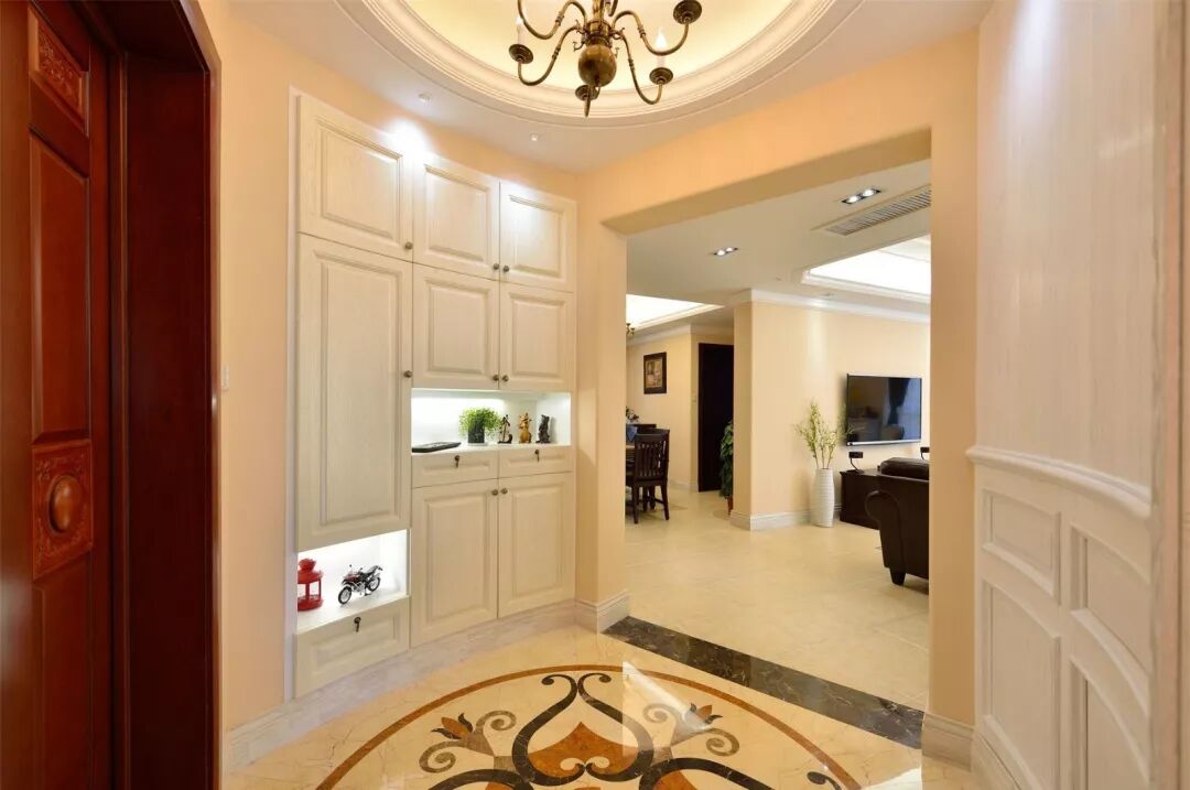 一进门就是一个独特的圆弧型门厅空间,鞋柜都被嵌入了墙体当中,让过道门厅变得更为宽敞,藏光空间摆放一些装饰品,也非常好看。