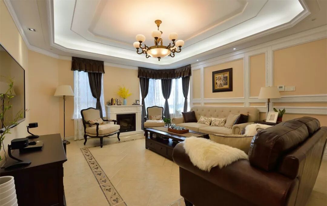 客厅的墙面采用了温馨、浪漫的米粉色搭配石膏线条边框的装饰,还有独特的跌级吊顶加上藏光的设计,更显大气时尚。