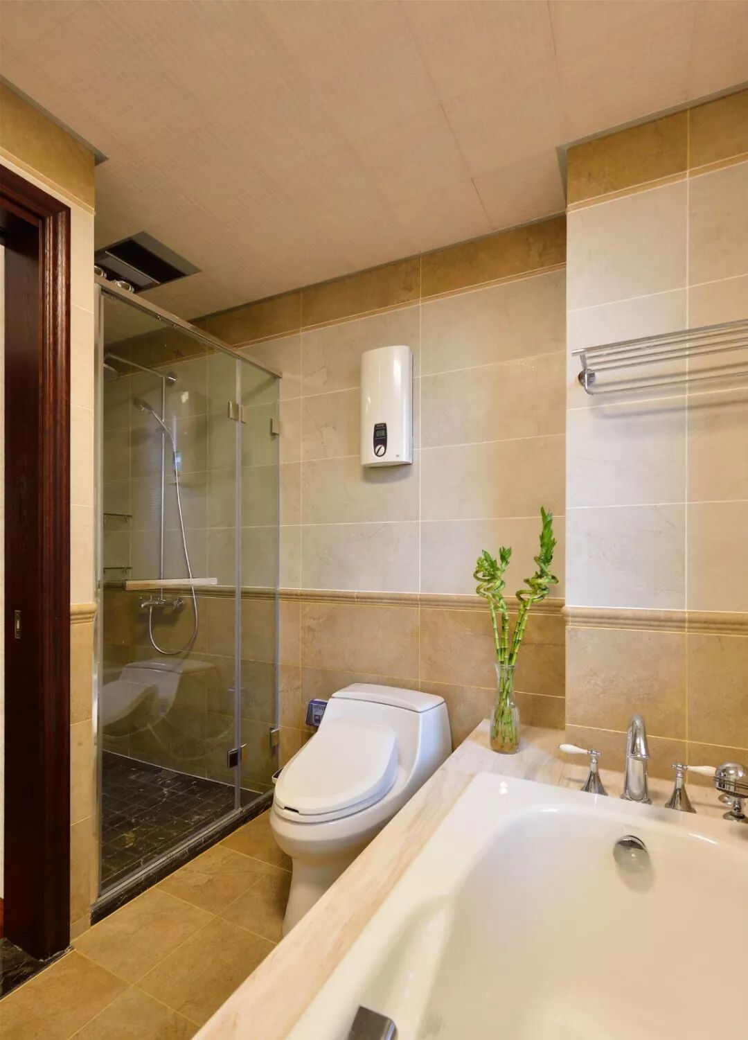 卫生间内部空间非常宽敞,所以浴缸和淋浴房的设计都有,方便屋主在工作之余可以享受惬意的泡澡,没时间的时候也能直接淋浴。