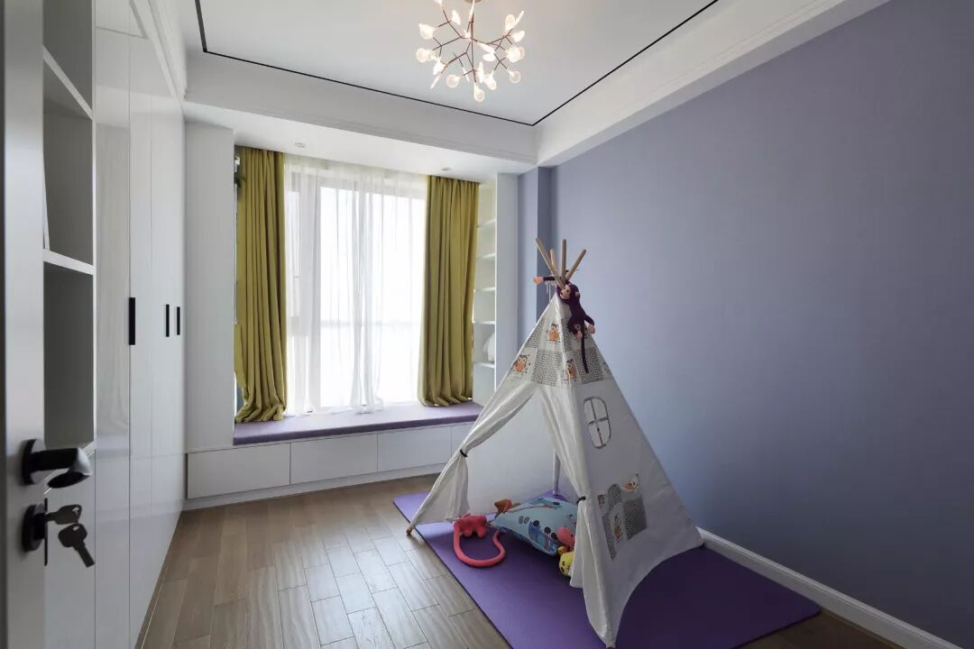 儿童房内部暂时留空,摆放一个帐篷给孩子玩耍即可,侧面做个到顶的嵌入式柜子,紫色的墙面和地毯、飘窗坐垫相互呼应。