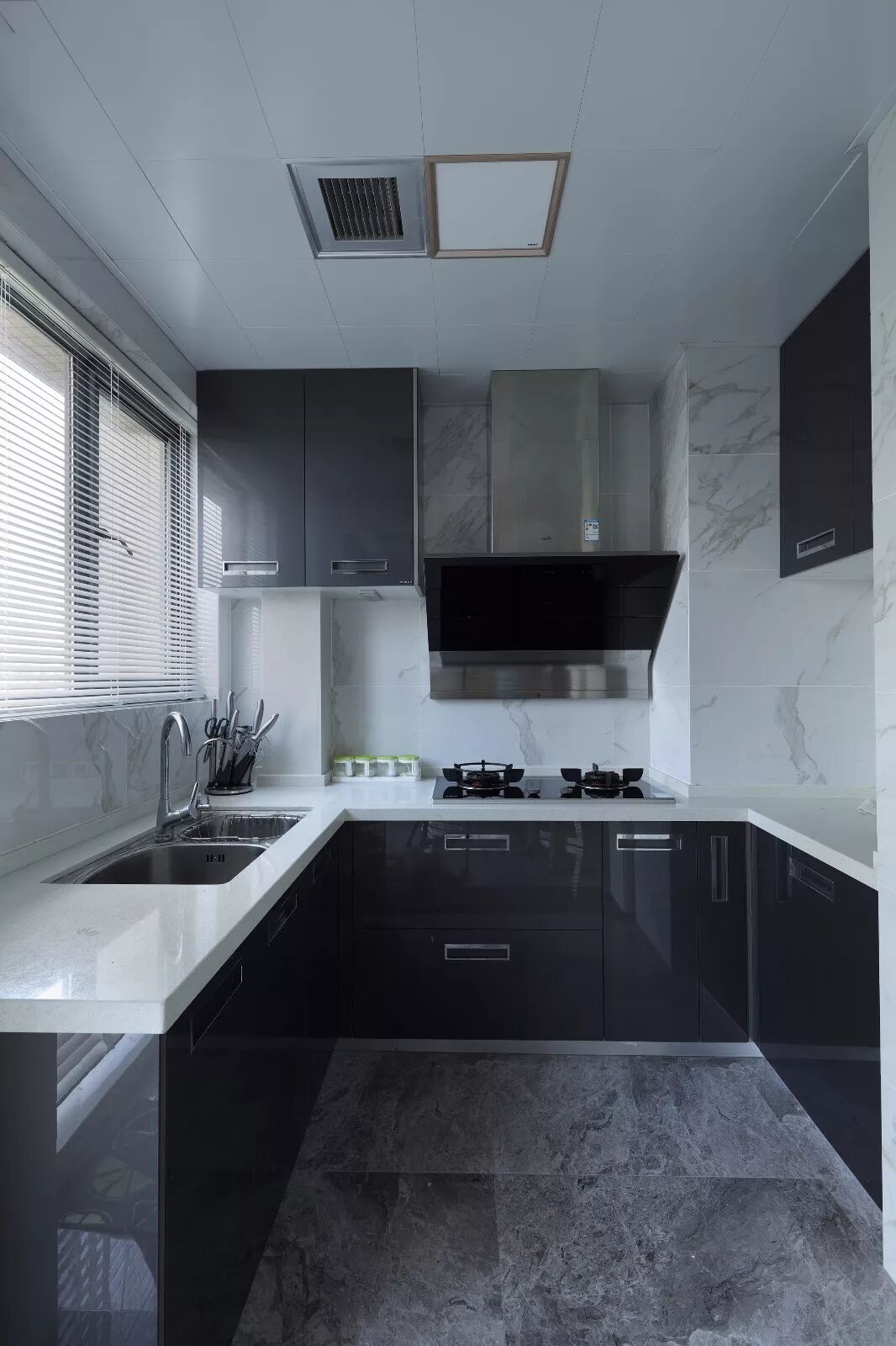 厨房内部是U字型的橱柜布局,色彩以黑白为主,在满足收纳和使用需求的同时,也给人带来整洁、干净的感觉。