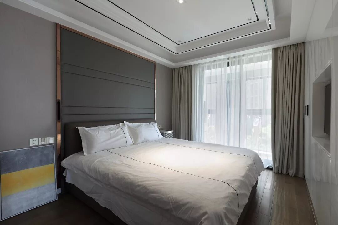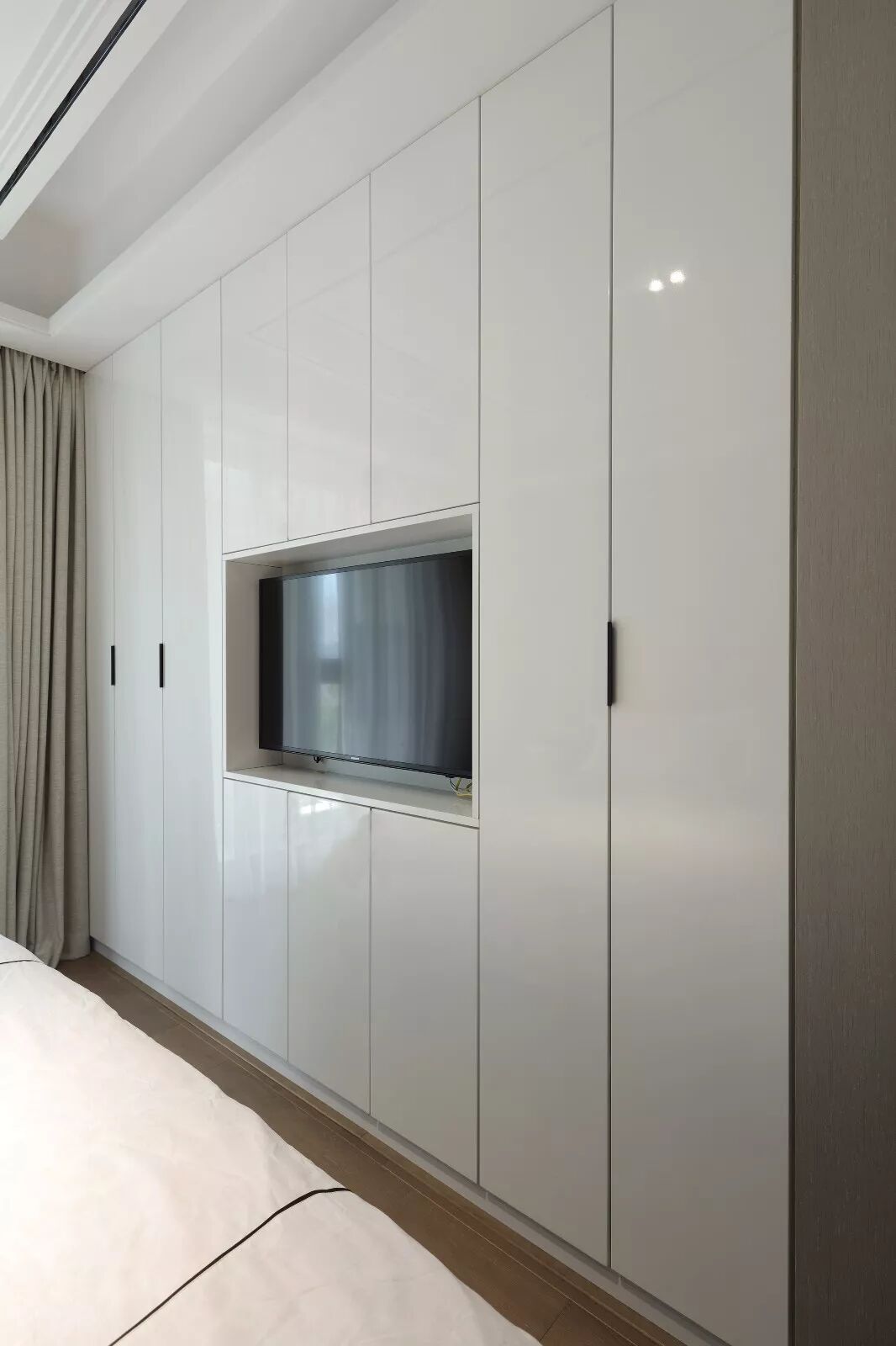 床尾整面墙被改成了嵌入式的到顶衣柜,在衣柜的中间嵌入电视,白色柜子搭配灰色的墙面,显得非常的整洁利落。
