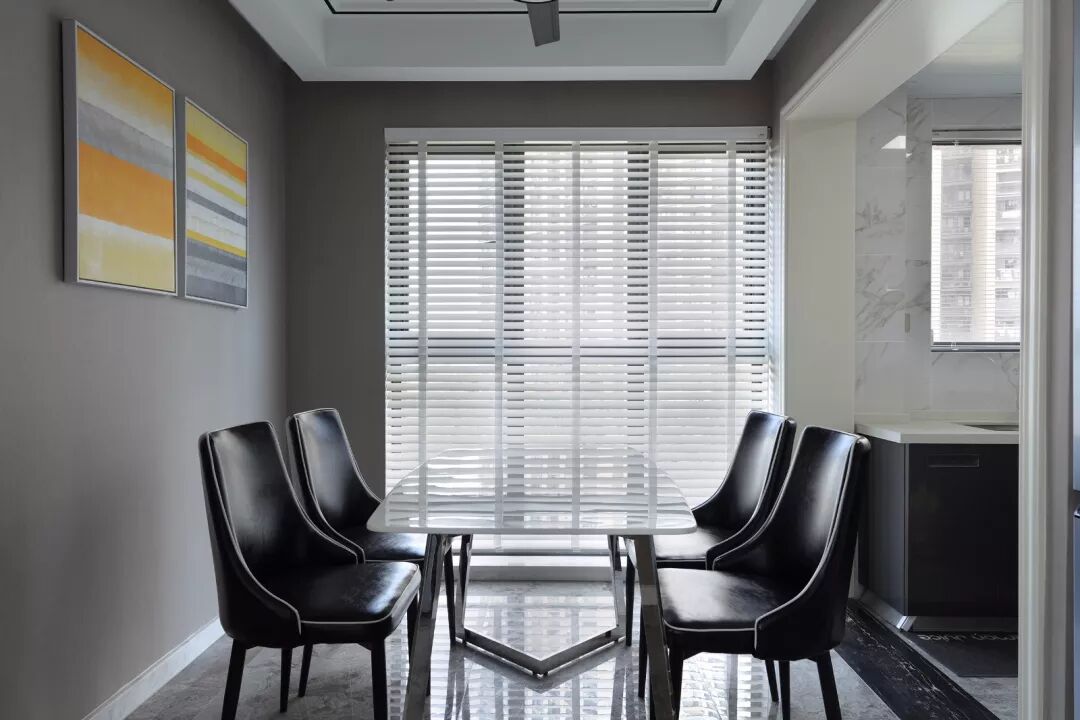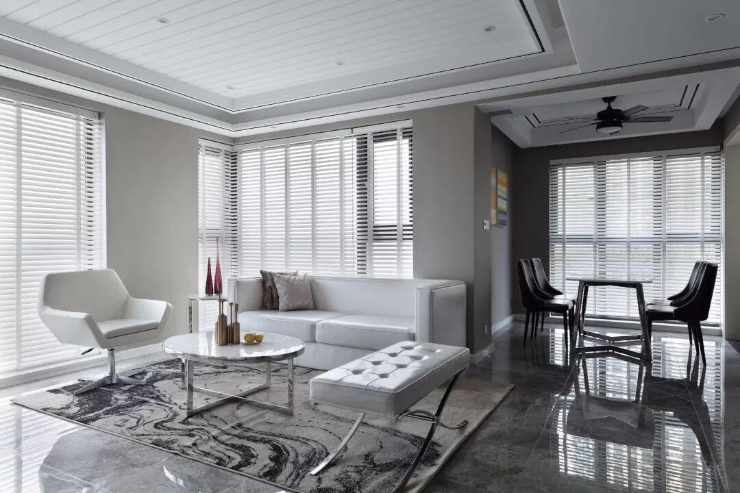 整个客餐厅都是通铺的仿大理石瓷砖,灰色的地砖和墙面搭配白色的沙发、茶几和百叶帘,展现出轻松、简约的美感。