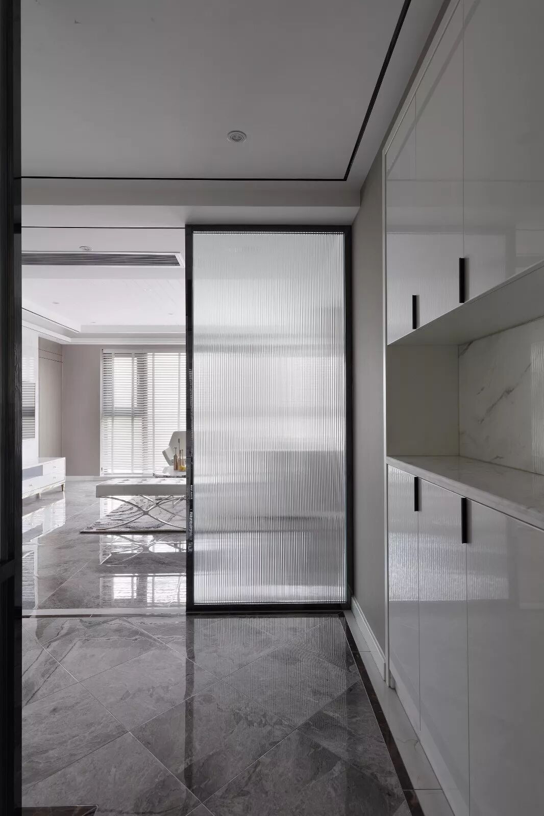 入户玄关门厅和客厅之间用磨砂玻璃作为隔断,右侧嵌入式鞋柜中加上了大理石的设计,更显高档,地面斜铺的瓷砖,带来更好的延伸感。