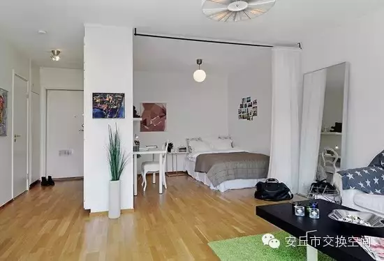 编辑点评:用白色的帘布隔断客厅和卧室,空间瞬间一分为二,有效地保障卧室隐私的同时也不会完全遮挡光线。