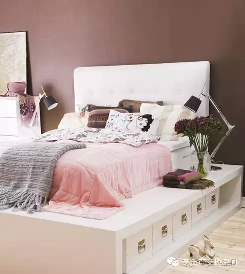 编辑点评:大床靠墙角放置,为有限的卧室空间腾出更多活动区域,大床因省去了床背而更加自然地与墙壁相融,从视觉上扩充了空间感。