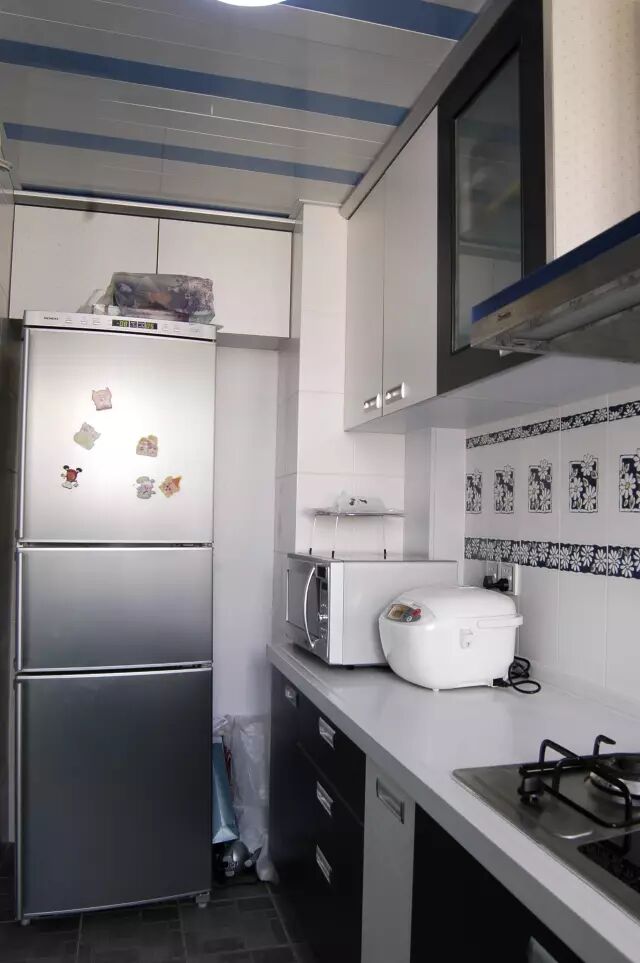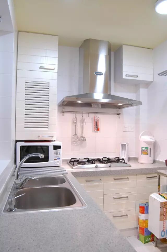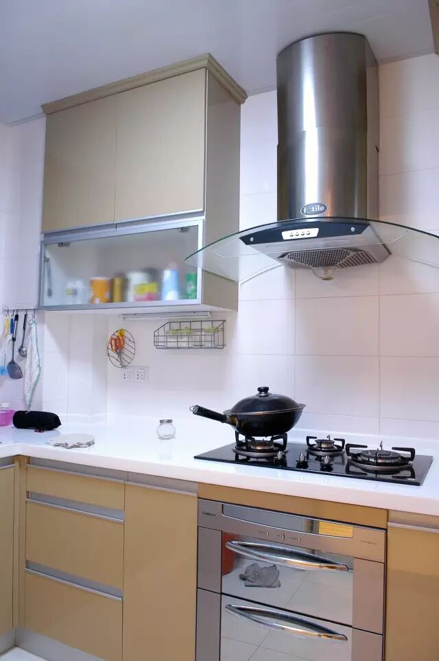 脱排油烟机、灶具、冰箱是传统厨房的三件套。除此以外,如何添置电器,都由业主来定。微波炉的位置预留好,且厨电颜色和橱柜也协调一致。
