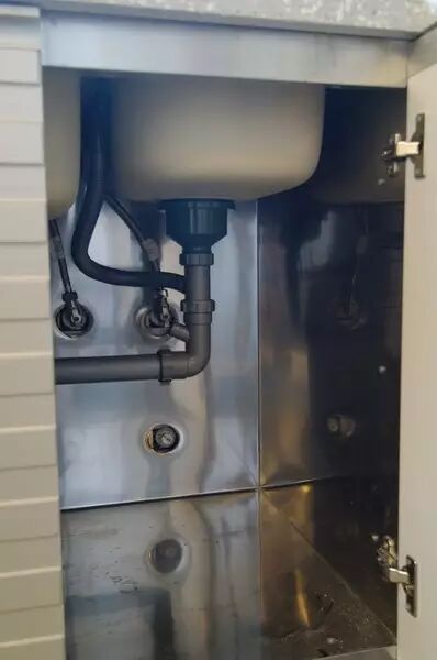 业主爱干净,不希望水槽下柜子受潮,积聚污垢,设计师在水槽下设计了不锈钢板贴面,达到了干净易清理的要求。