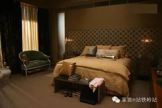 Serena的卧室展示出时髦的新颖和古典的风靡一时的物品之间一种自信的,折衷的融合。通过大胆的图案以及金属质感的格调来装饰。显然,没有任何一件家居摆设表现出“我是一个居住在上东区的已经改过自新然而又故态复萌的坏女孩”,就像是卧室内的照片——璀璨发光的眼影一般!金银色的比例运用恰到好处,丝毫不显庸俗和浮夸。大面积的金色壁纸,加之小范围的银色靠包,原本迥然相异的色调完美营造出了奢华贵气的卧室风格。