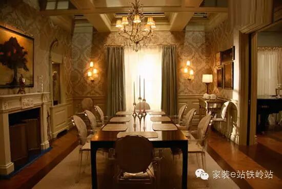 华丽的玻璃吊灯悬挂于大型的餐桌上,典雅的壁纸装点着宽大的餐厅的墙壁。餐厅的空间非常的宽大,无疑连餐厅都要塑造一种豪华风。