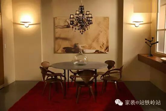 餐厅拥有完美的质感和色彩。墙上的艺术品和墙面的颜色十分匹配。这种颜色并不显眼突出,却仍然趣味十足。我们都钟情于那盏黑色的枝形吊灯,还有那张大理石顶的丹麦桌子。至于那块红色的长绒地毯,确实它在现实生活的家具布置中显得不太实际,但是,它看起来不是很华丽吗?