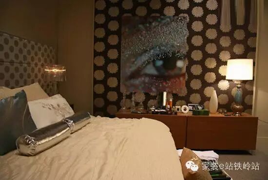 乍看之下,完全就是陈腐的格调(金属色的枕头,金色绸缎的被褥),但却不乏时髦的设计(床头柜上的灯饰),古色古香的发掘(床头柜),以及一些意料之外的物件(金色的波尔卡圆点面板/床头板)的结合体。中性色的广泛使用让卧室看起来大气婉约,床头由浅至深的色彩运用是中性色渐变搭配中永不落俗的经典手法。欧洲经典的卷草纹细腻优雅,象征着生命生生不息,最适合与流行的欧式家具进行组合。Serena的卧室就这样张扬着她的个性:一种与生俱来的美丽和自信。