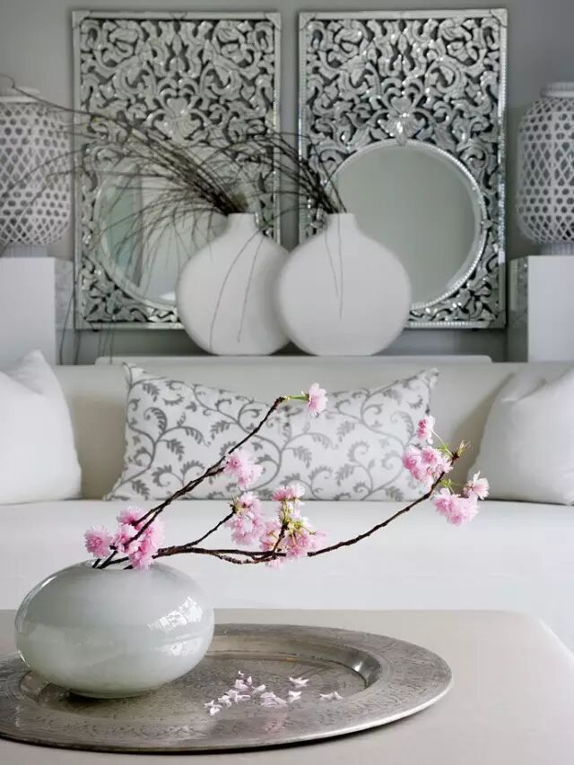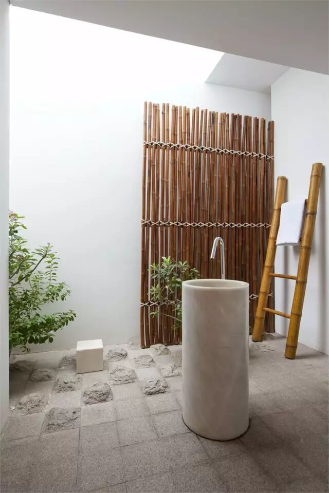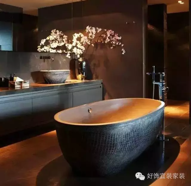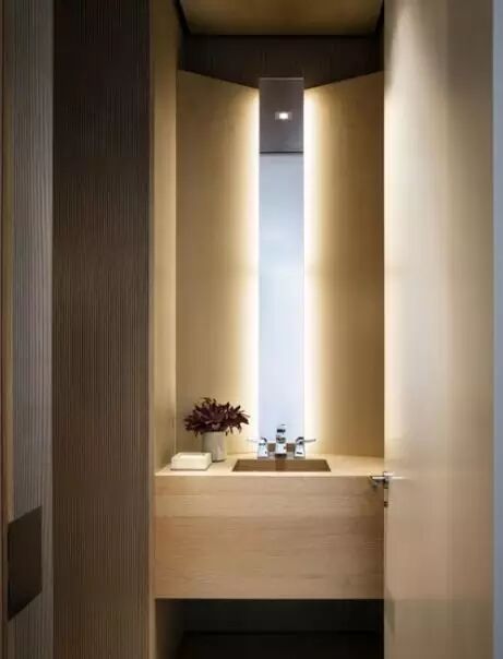 洗手间的小面积,适合瘦长型花艺,或者托盘式与洗漱用品组合陈设。