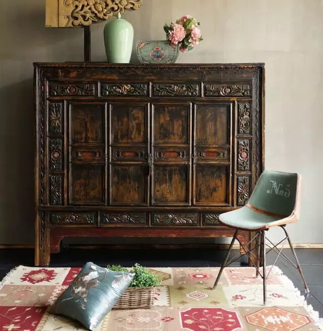 边柜主要是玄关,门廊,和空间墙体空白填充家具的功能,此花艺的高度与人的视点等高,所以是花艺中运用最广泛的陈列形式。主要展示面是在其正面,所采用的是扁平的体量形式。