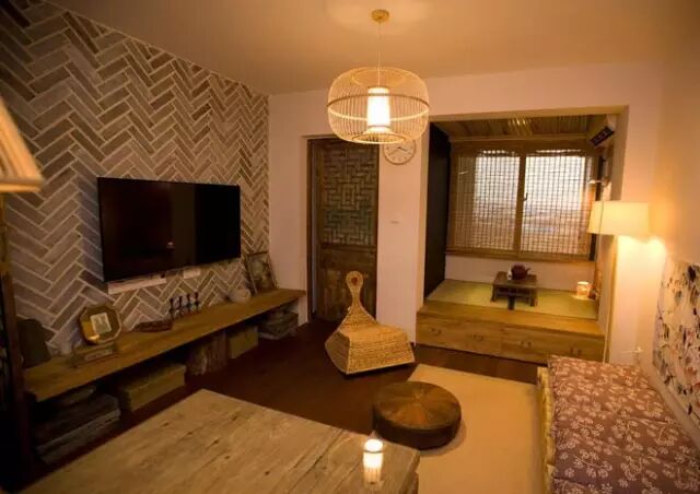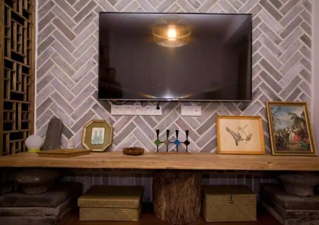混搭中式,土窑烧出的文化砖人字贴砌出斑驳的感觉,实木电视台面由两个柱头和若干老灰砖撑起,分量感很重,竹子吊灯里黄色的灯光洒满整个空间。