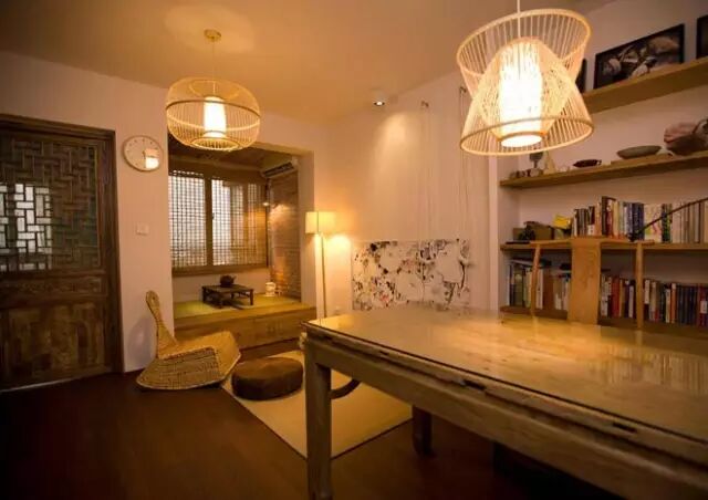 餐桌由上百年的老门板木料重新加工,获得了生机,历史的厚重感充分表露,实木地板为二手老地板,重新铺设打蜡,上面的浅色剑麻地毯增加了区域感。
