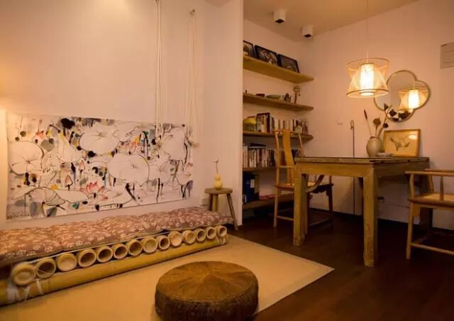 一个樟木箱作为换鞋凳试过吗?感觉不错,旁边的柜体满足了外套和鞋子的收纳,过道的地面选用了进口artdeco风格复古砖。这里是可以彻底放空的位置,坐上竹筏,神游到天涯,棕草垫为老师傅手工编织,手艺近失传。