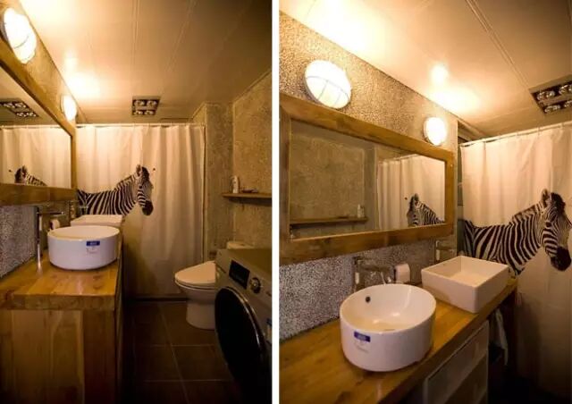 白色斑马浴帘让灰色水磨石的墙面有了亮点,配以深色地砖,实木台盆柜更有素朴的韵味。