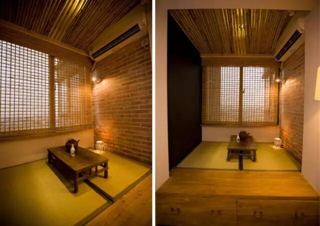 阳台的吊顶选用了竹子,窗帘为芦苇帘,老炕桌是清末的淘品,榻榻米的垫子为蔺草编织和泛红的青砖可以吸收窗外的潮气,中和室内湿度。过小的阳台不如作为客厅的空间延伸,给它一个喝茶休闲储物的功能,何乐而不为?