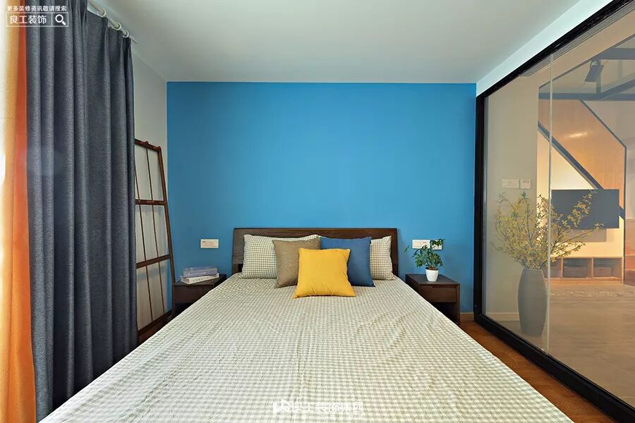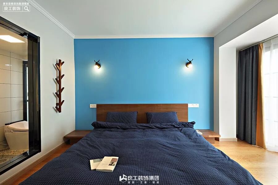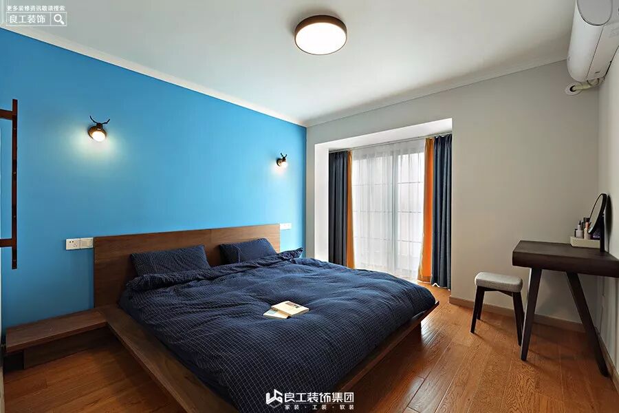 最爱的蓝色做床背景,原木榻榻米式床,卧室简单清爽没有过多的装饰,让人感觉放松舒适。