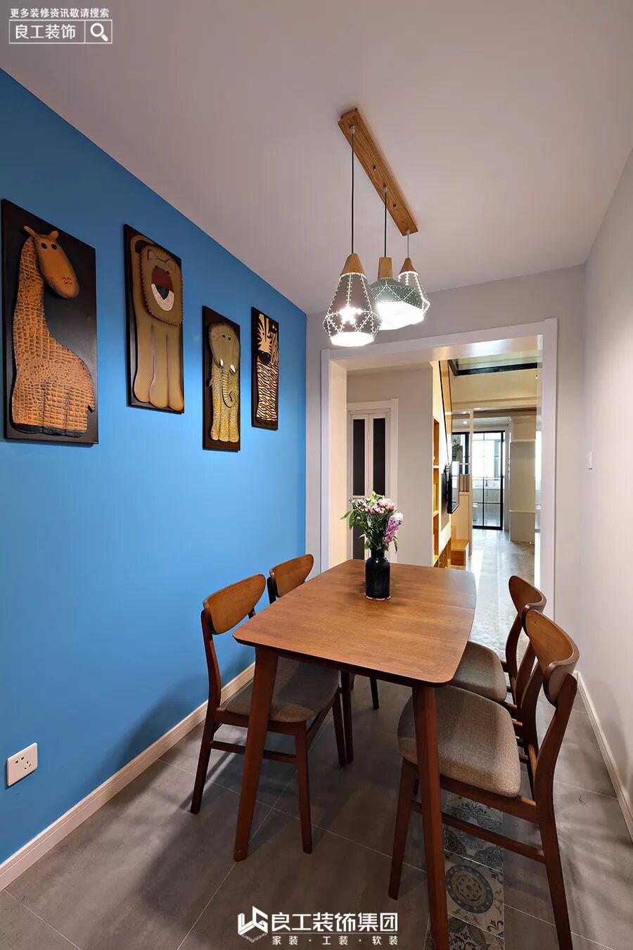 餐厅很简单,原木色的餐桌椅,搭配屋主最爱的蓝色调墙面,空间不大却正好够用。
