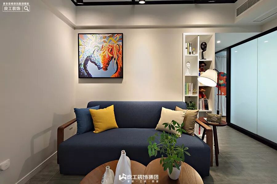 蓝色布艺沙发搭配黄色抱枕,墙上选的是屋主最喜欢的独角兽,整体色调以黑白灰为主,软装点缀跳色,营造出温馨舒适的感觉。