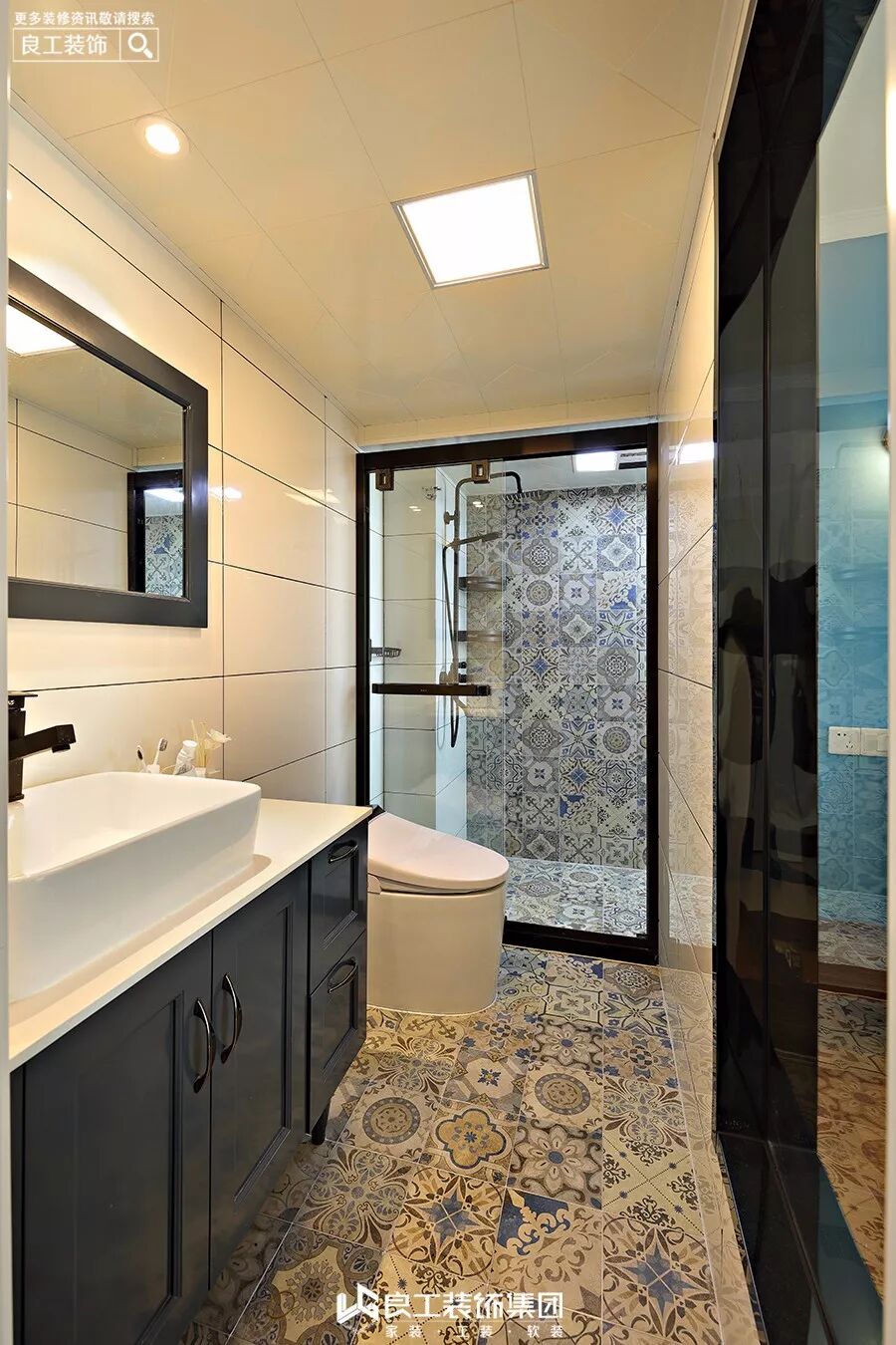 卫生间蓝灰色花砖从地面沿到淋浴房墙面,整体黑白色搭配,空间不大却感觉并不拥挤。