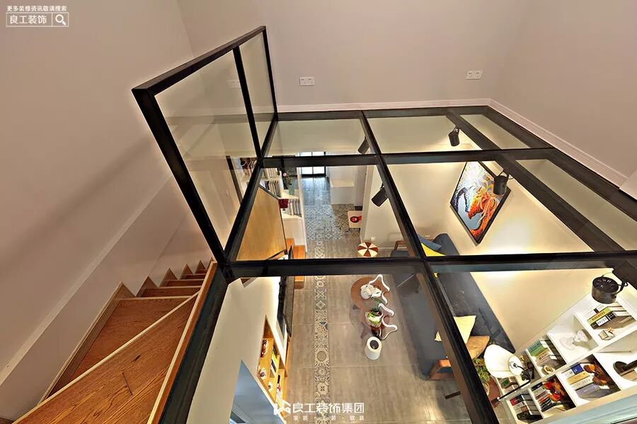 透过二楼玻璃看楼下,楼上楼下遥相呼应,而且也将这块空间很好的利用起来。