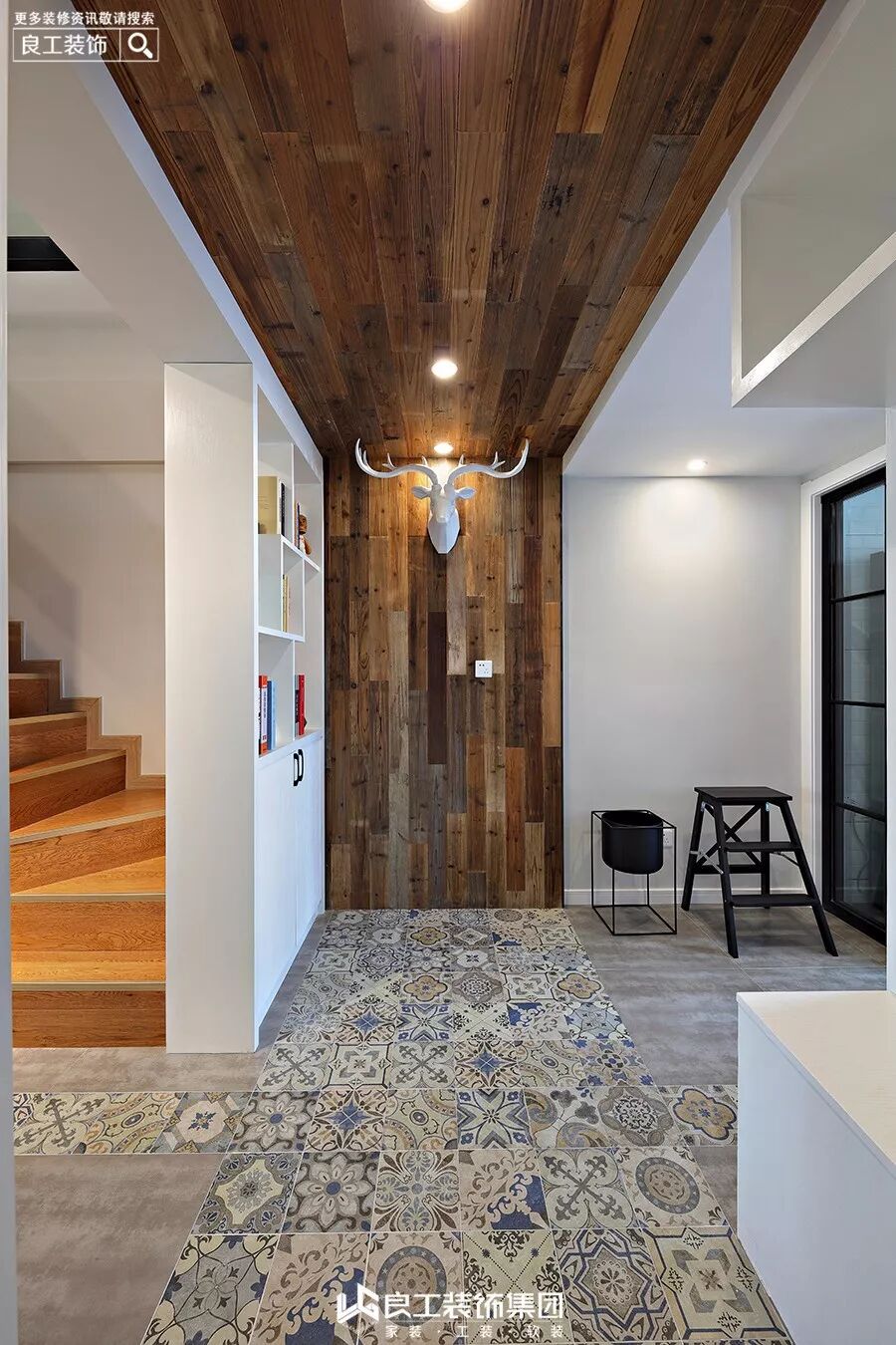 玄关设计非常个性,花色小砖搭配木地板玄关背景及顶面,完全体现屋主的年轻张扬的审美。