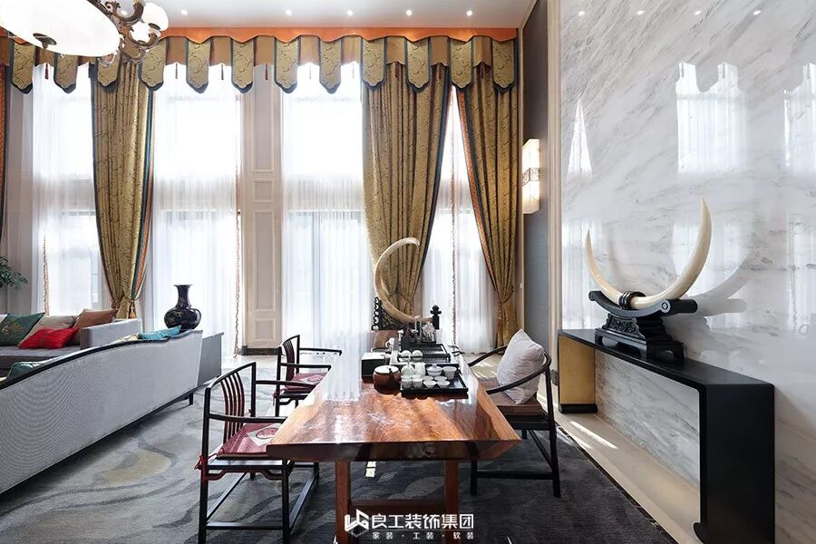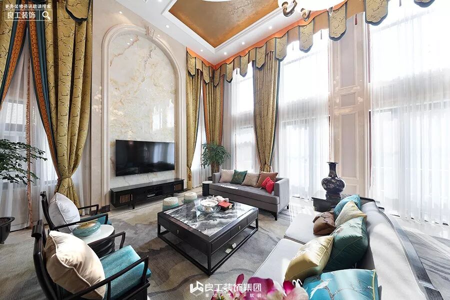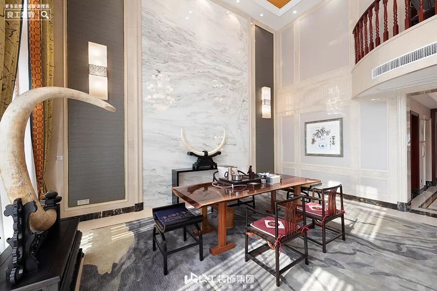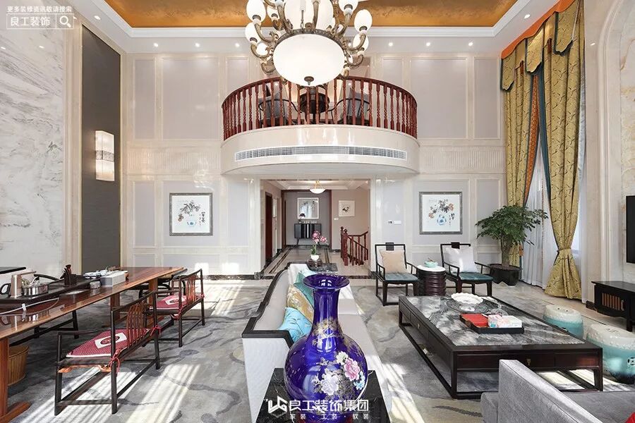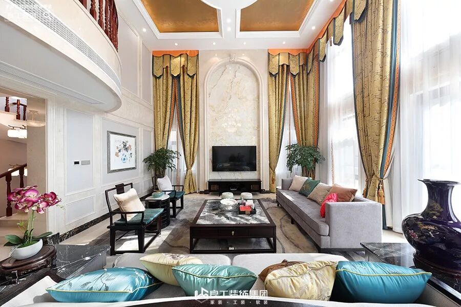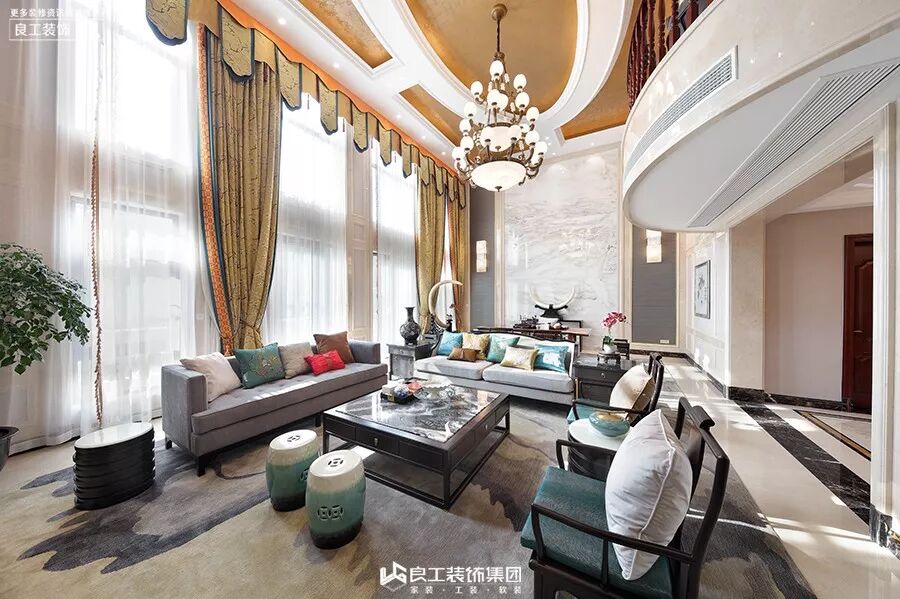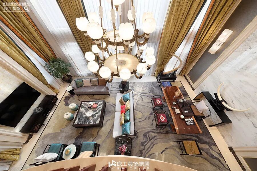 客厅的沙发采用中式圈椅和布艺沙发结合,搭配中式抱枕,大理石云纹地面,金色窗幔,多层灯具,配以挑空的高度,有一种古朴典雅气息。