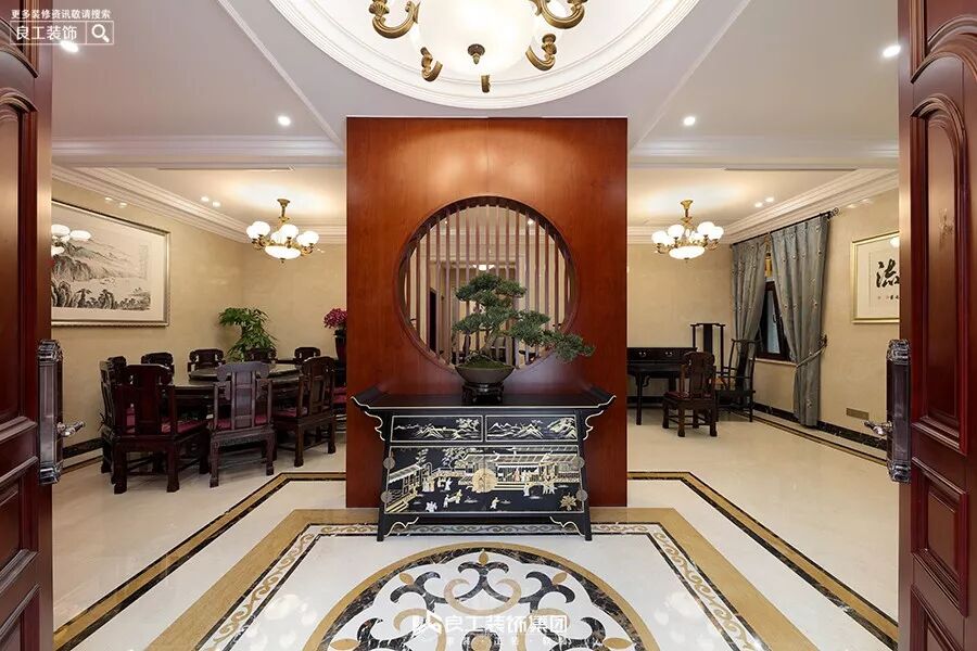 入户玄关天圆地方,地面圆形拼花又与顶面遥相呼应。金粉雕花的玄关柜搭配一扇圆形窗户,还有青松盆栽,整体韵味悠长。