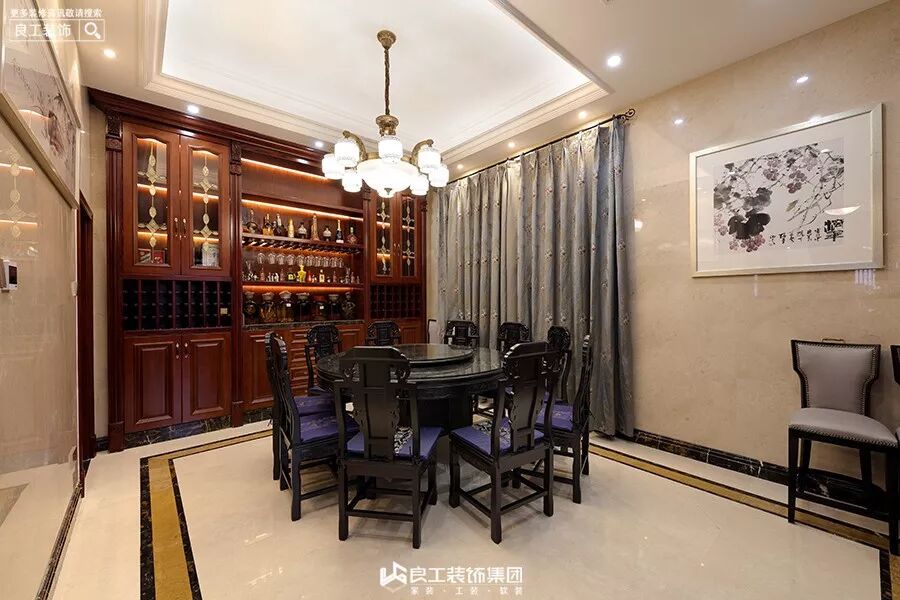 中式餐厅少不了的就是圆形的实木餐桌,高靠背雕花实木餐椅,搭配实木酒柜,过节的时候一家人欢聚一堂,幸福的感觉萦绕其中。