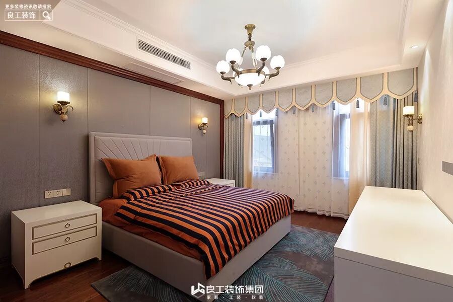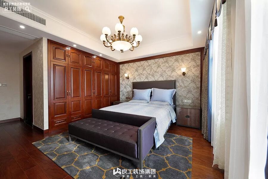 主卧沿袭整体色调,采用胡桃木色的柜门、房门,搭配复古的壁纸、窗帘,房间就是让人感觉放松的空间。