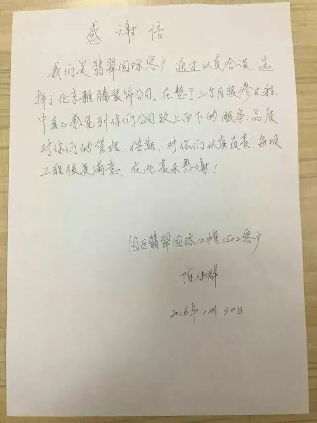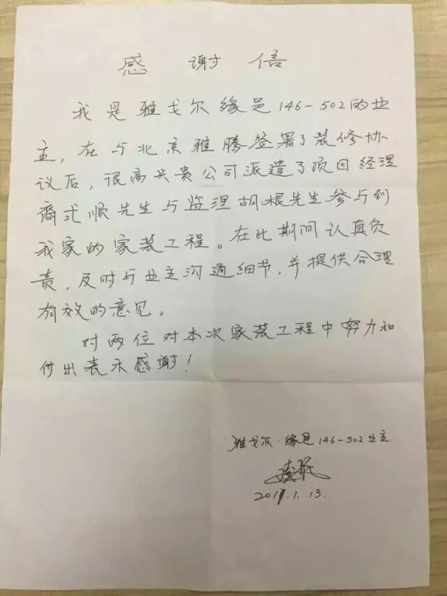 新年伊始,客户纷纷发来了感谢信,其中夹带着对北京雅腾装饰的肯定和认可。