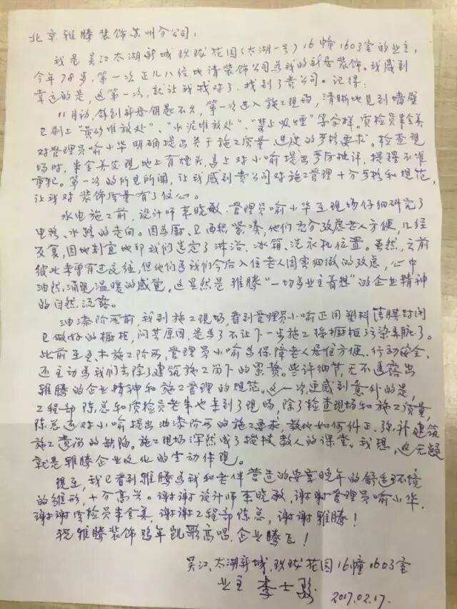 吴江太湖新城业主对北京雅腾装饰全程施工赞不绝口