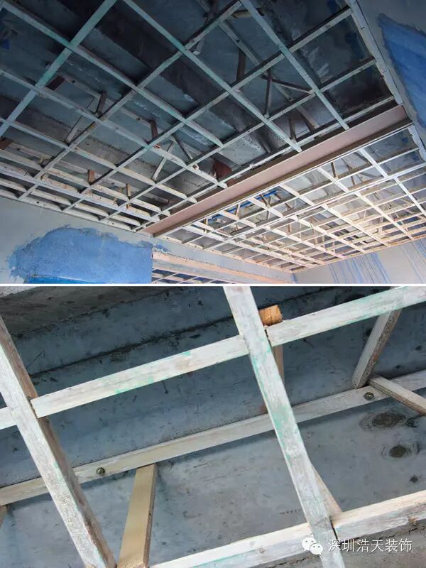 首先要在天面,就是建筑物最上面的屋面,放线定位。之后,就是安装龙骨,龙骨是一种骨架,用来做吊顶的基础材料。