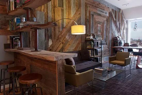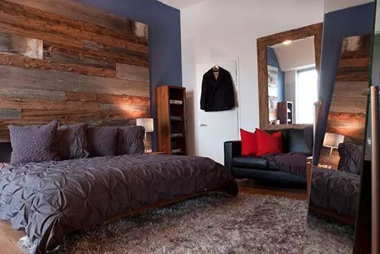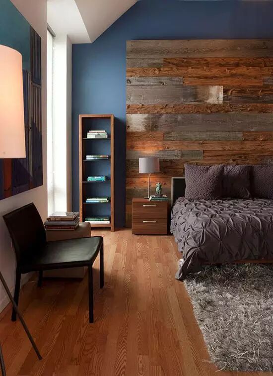 刷成蓝色的墙面与粗糙原木床头背景墙,