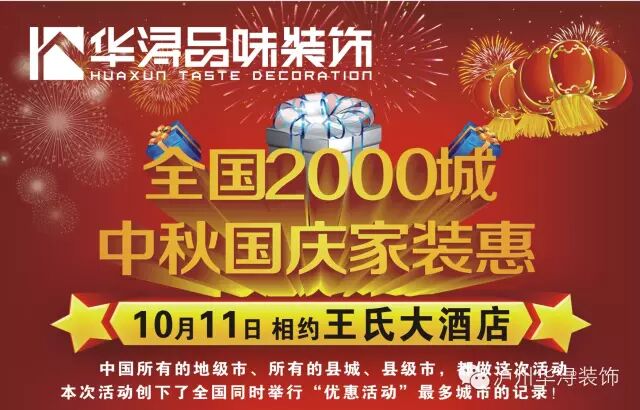 华浔携手2000城10个商家,共同举办中秋国庆家装盛惠,本次盛惠让你一天把所有家居建材全部搞定,这一天的时间让你省钱省到心跳,这一天为您准备了数十份礼品免费等你来拿。您不来就亏大啦!!来了就赚大啦!!