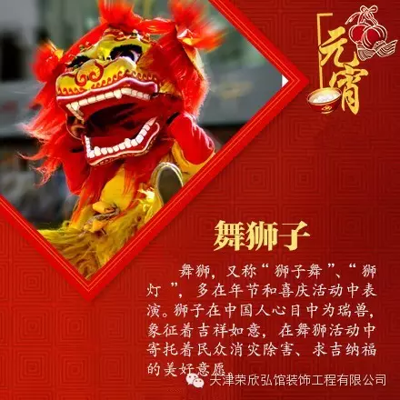 ①吃“元宵”:寓意团圆和美;②猜灯谜:元宵灯节派生出来的文字游戏,也叫打灯虎;③耍龙灯:龙是中华的图腾,舞龙灯,载歌载舞,氛围喜庆;④舞狮:象征吉祥如意,寄托消灾除害、求吉纳福的美好意愿。