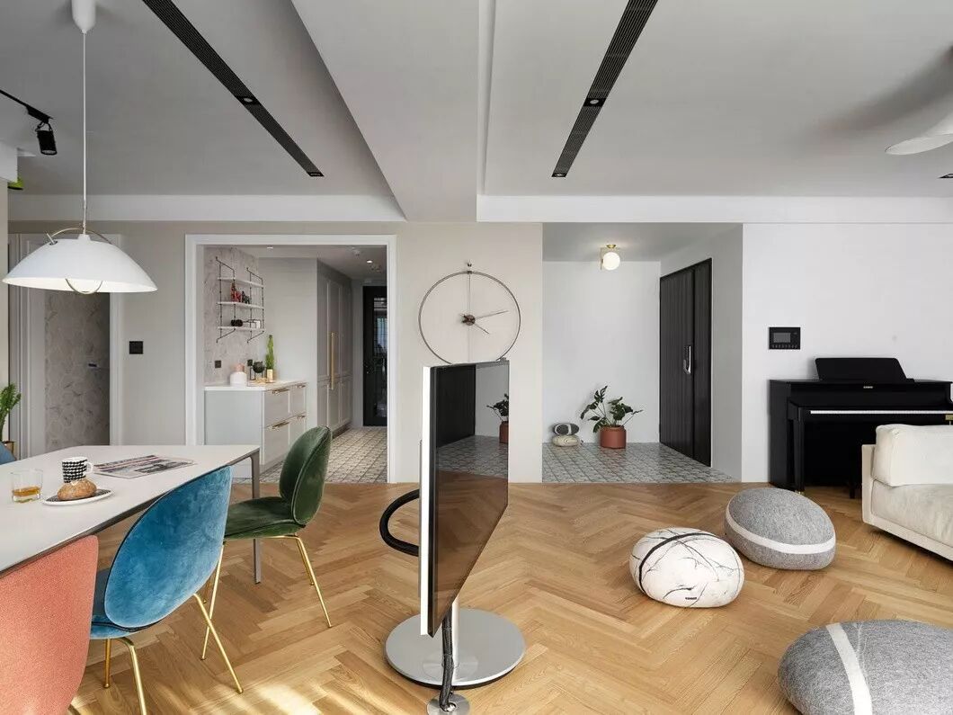 公共区域内,透过一面旋转电视墙的设定,除了做为客厅与餐厅区域的划分界定,也满足多视角视听机能,相比实墙更多了穿透感,促使光线照亮每一个角落
