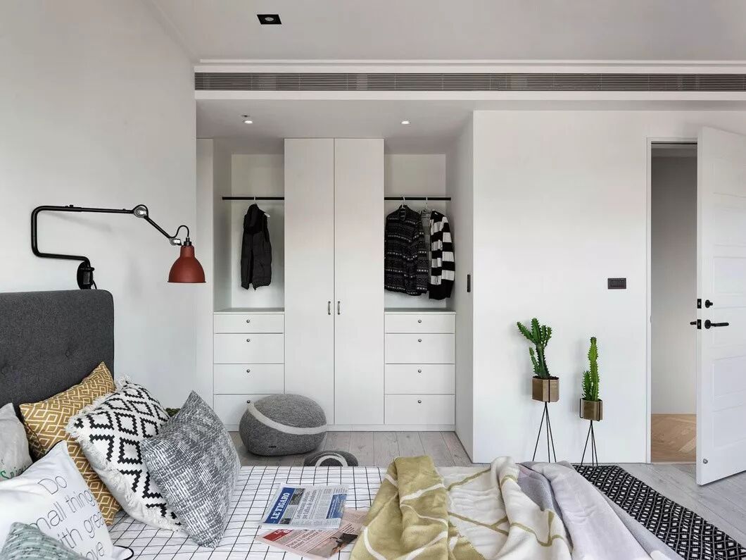 寝卧内,则呈现温暖的睡寝氛围,搭配多彩且具个人风格的软件,灯饰等,增添整体的丰富层次,而衣柜更沿着格局架构坐落一角,不占用空间的同时也倾注实用机能!