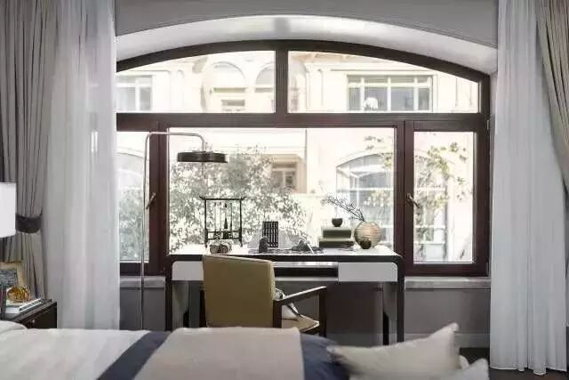 初入室内便能感受到事业的开拓,明亮透彻的落地窗上悬挂着象牙白的窗帘,即可伏案看窗外的物换星移,同时也能让整个空间有连贯的完整性。