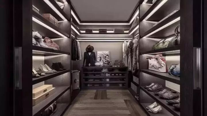 步入式衣帽间布局合理,收纳有度,安排合理的灯光 色调,即完美地呼应了卧室的整体风格,又有自我的一方天地。