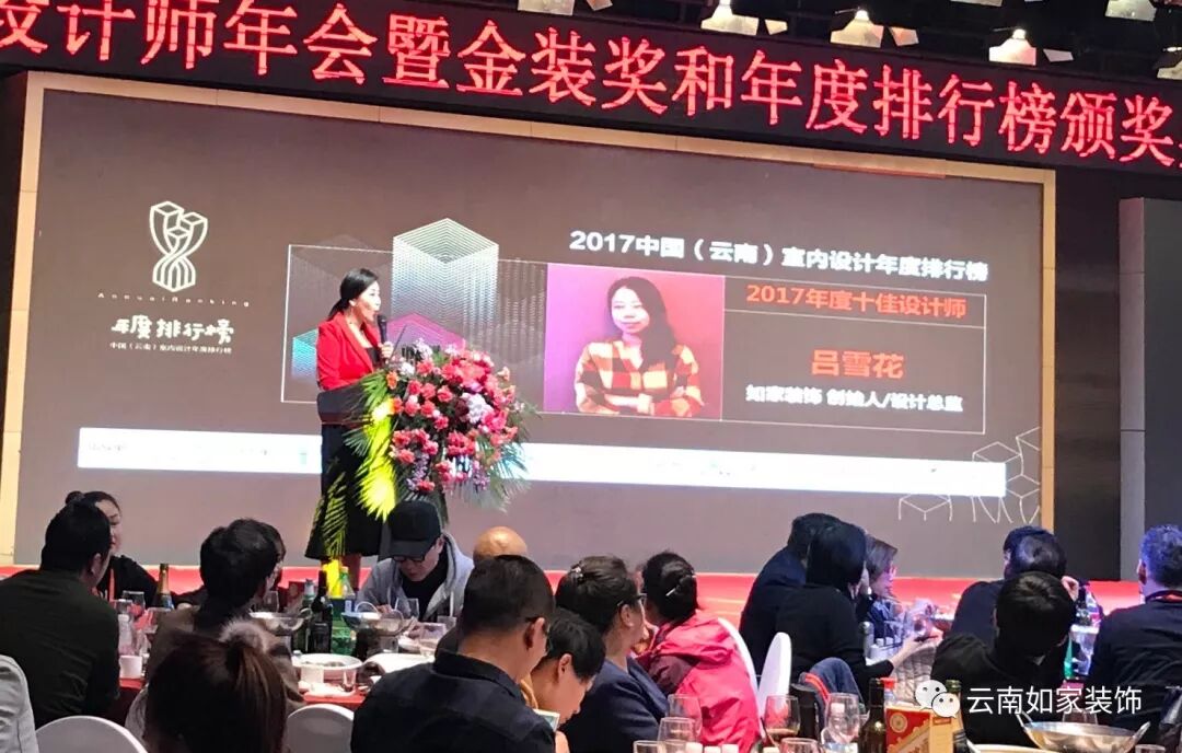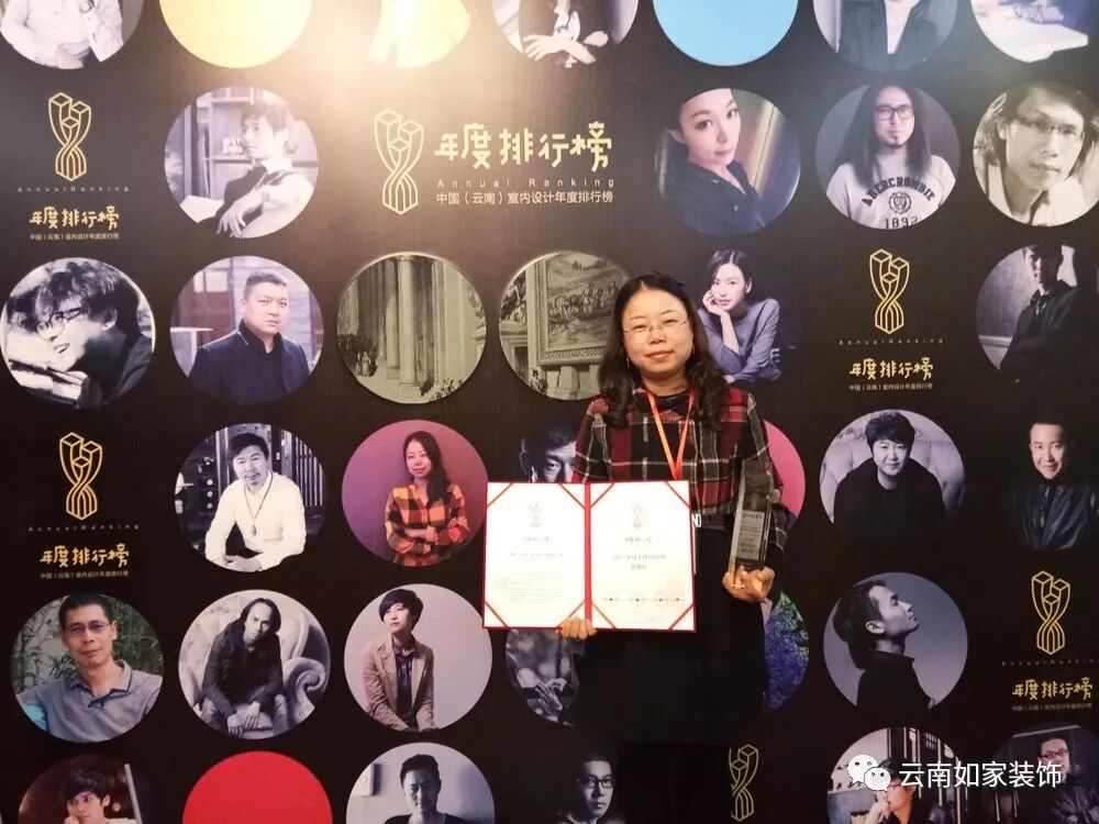 如家创始人兼设计总监——吕雪花女士在中国(云南)室内设计年度排行榜评选中荣膺“云南十佳设计师”此殊荣对此我公司深感荣幸