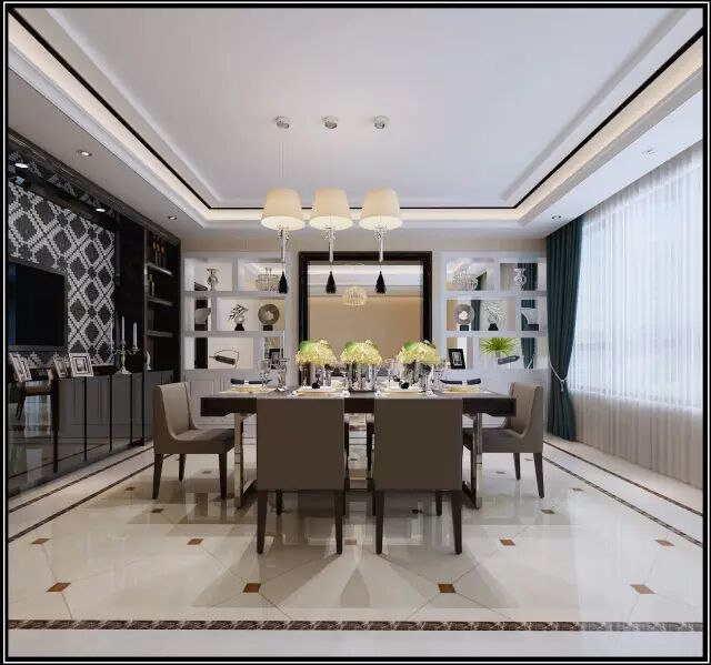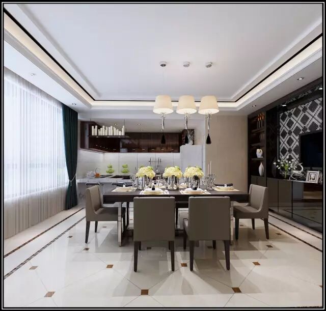 黑色的餐桌,深灰色的餐椅,位于宽敞明亮的空间中央,有点炫眼的吊灯,比较特别的是,餐厅空间,还拥有一面巨大的落地窗,运用白色的薄纱做遮挡,看起来相当的刚练,却又时尚感十足。