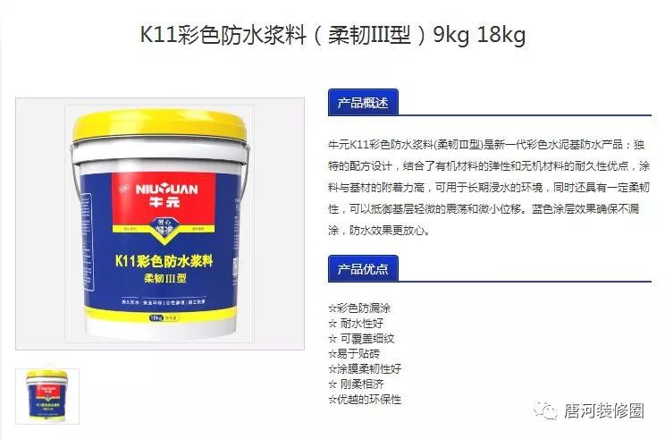 牛元K11彩色防水浆料(柔韧Ⅲ型)是新一代彩色水泥基防水产品;独特的配方设计,结合了有机材料的弹性和无机材料的耐久性优点,涂料与基材的附着力高,可用于长期浸水的环境,同时还具有一定柔韧性,可以抵御基层轻微的震荡和微小位移。蓝色涂层效果确保不漏涂,防水效果更放心。