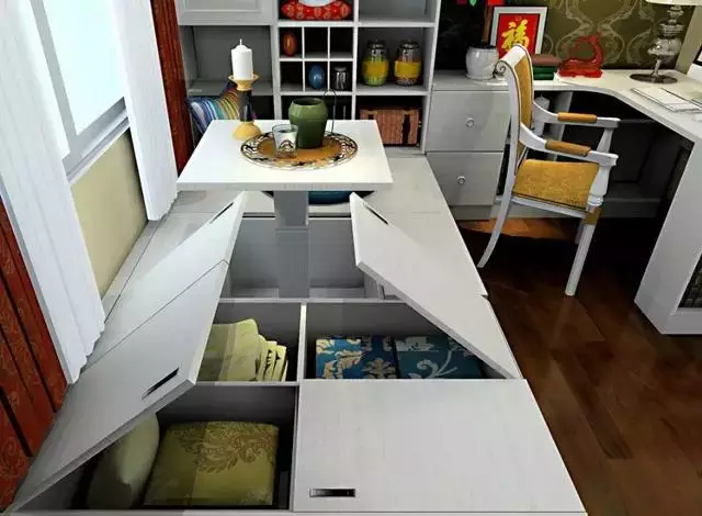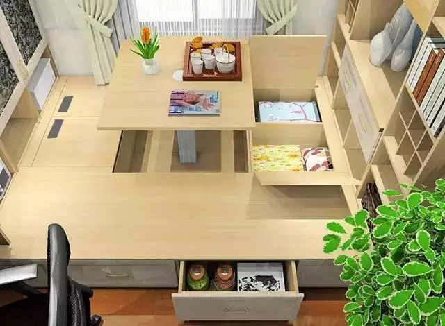 升降台升起来可以当桌椅招待客人,降下来可以当床用。
